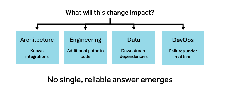 Ask that question across architecture, engineering, data, and operations, and you will get different answers. Architecture points to known integrations based on design intent. Engineering identifies additional paths in the code that will also be affected. Data teams trace downstream dependencies through pipelines and derived datasets. DevOps surfaces impacts that only emerge under real runtime conditions (e.g., load, failover, retries).